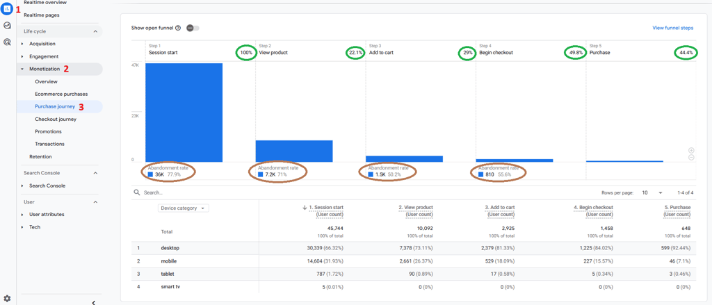Dans Google Analytics 4, vous pouvez visualiser ce tunnel en allant dans "Rapports" puis "Monétisation" et "Parcours d'achat" (ou "Purchase Journey" en anglais).