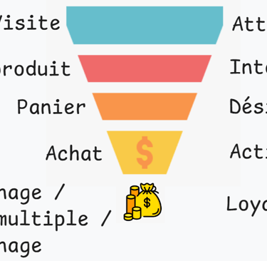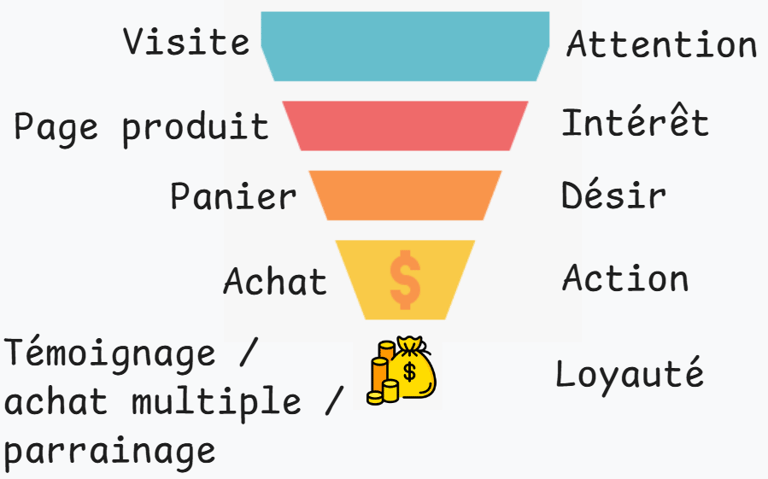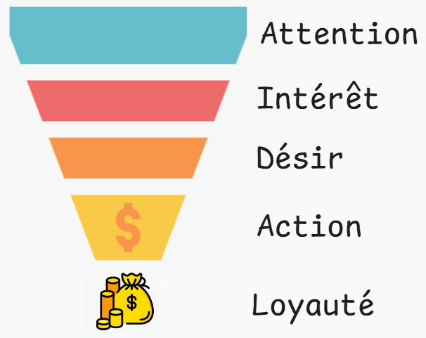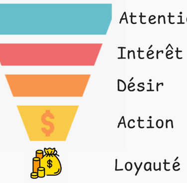 Si vous avez déjà suivi un cours de marketing, vous connaissez probablement le modèle AIDA (Attention, Intérêt, Désir, Action). Pour les e-commerces, on peut y ajouter le "L" de Loyauté.